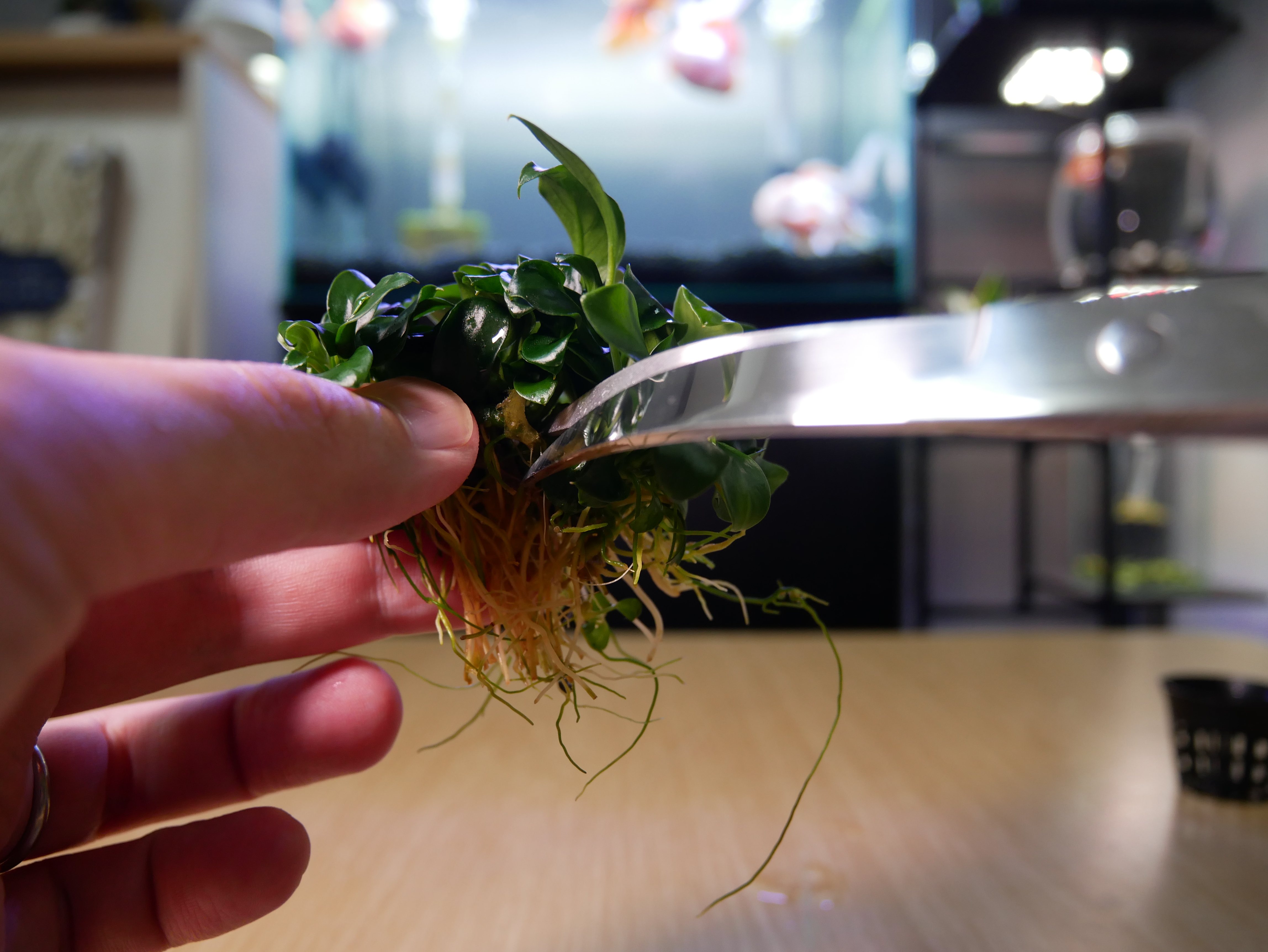 でも、ちょっとした裏技を使えば、ピンポンパールのプニちゃん水槽(金魚鉢)のような小型水槽でも、お洒落な水草レイアウトを楽しめます!