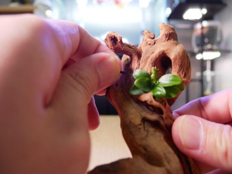 モビロンバンドで、流木とアヌビアスナナプチを固定する